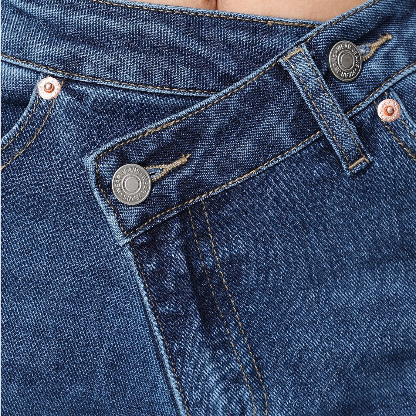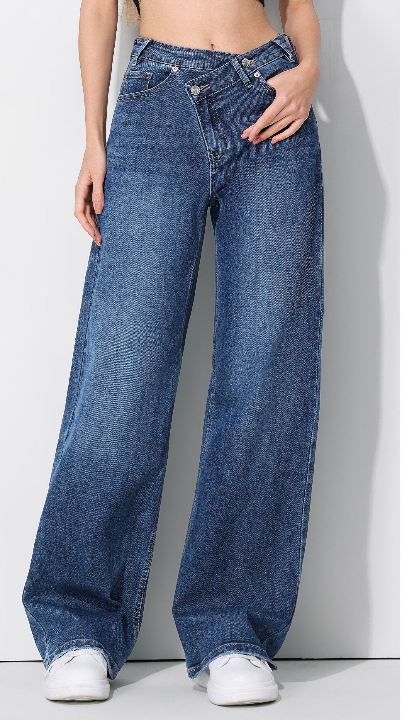 Deze trendy wide leg jeans met een unieke asymmetrische sluiting is een echte eyecatcher! De denim heeft een mooie diepblauwe wassing en valt soepel over de benen voor een stijlvolle, relaxte look. De hoge taille met dubbele knoopsluiting accentueert je figuur en geeft de jeans een moderne twist.