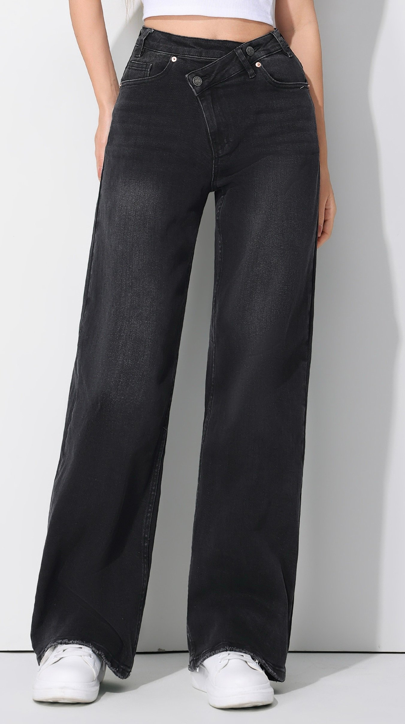 Ga voor een edgy en stijlvolle look met deze zwarte wide leg jeans met unieke asymmetrische sluiting. De diepe zwarte wassing geeft de jeans een stoere uitstraling, terwijl de hoge taille en wijde pijpen zorgen voor een flatterend silhouet. Perfect voor een casual outfit met een twist!