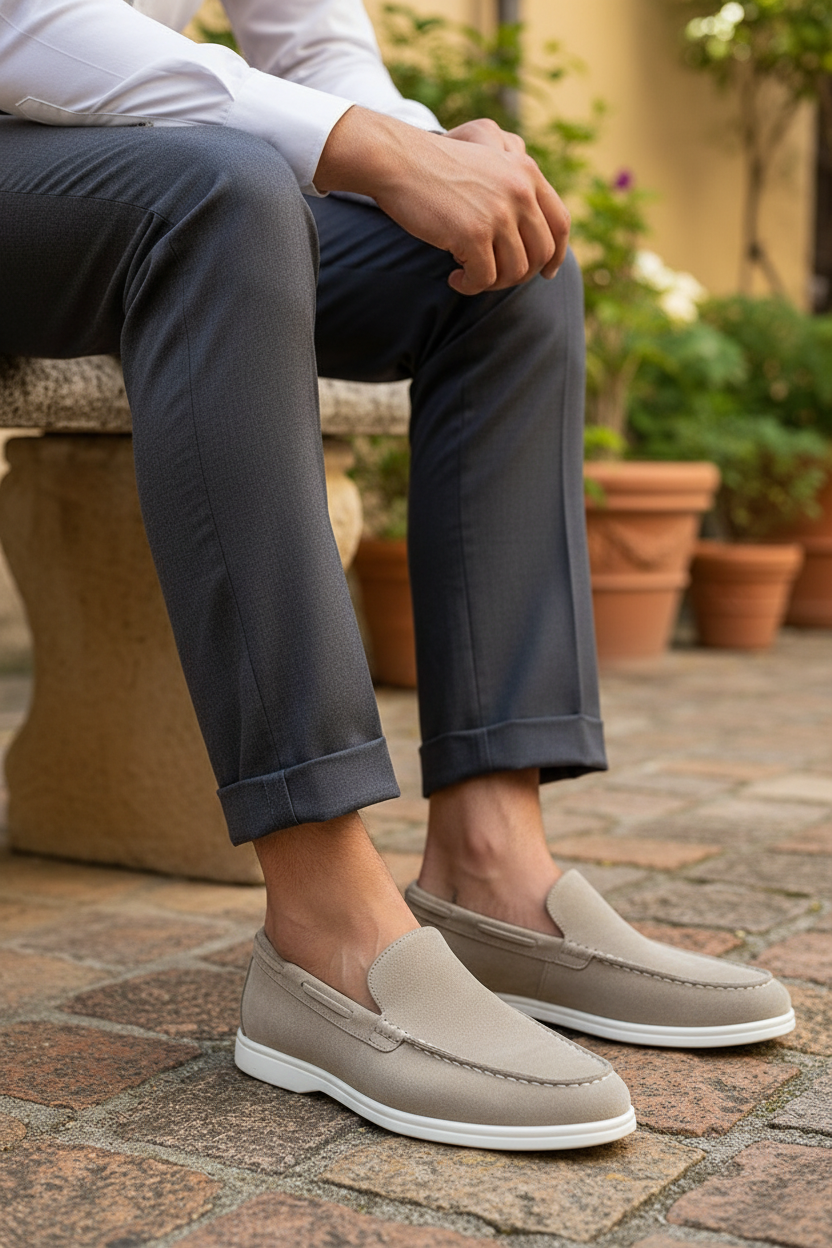 Stijlvol en neutraal: deze beige loafers hebben een buitenkant van hoogwaardig suède, een leren binnenkant en een stevige witte rubberen zool. Makkelijk te combineren met lichte én donkere tinten.