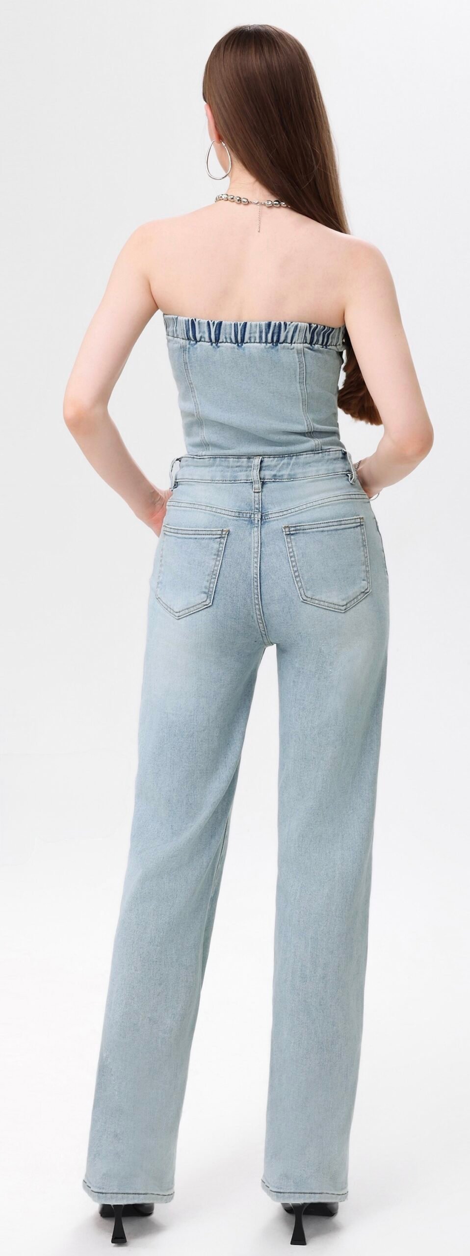 Ga voor een stijlvolle en moderne look met deze strapless denim jumpsuit. Het aangesloten bovenstuk met rechte neckline zorgt voor een elegante uitstraling, terwijl de rechte pijpen je benen langer laten lijken. Gemaakt van comfortabel stretch denim en afgewerkt met zakken en een knoop- en ritssluiting.