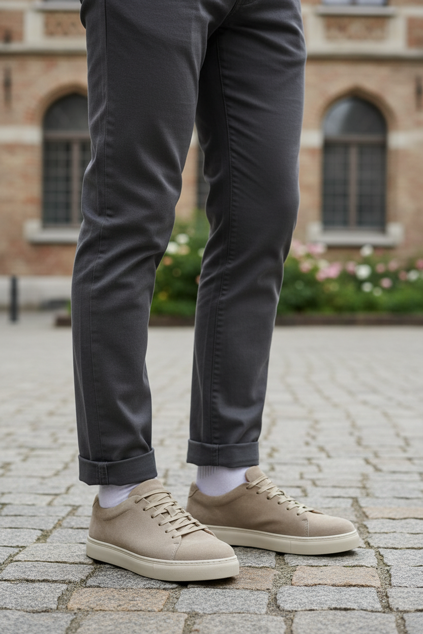Stijlvolle sneakers gemaakt van hoogwaardig echt leer, verkrijgbaar in beige suède of zwart velours. Het minimalistische ontwerp biedt zowel comfort als een luxe uitstraling, met een stevige rubberen zool voor goede grip en een vetersluiting voor de perfecte pasvorm.