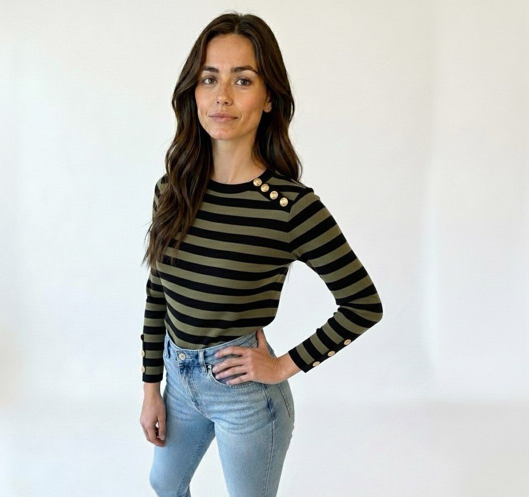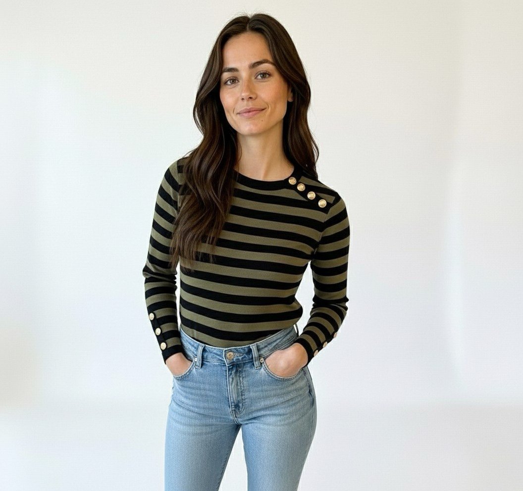 Deze elegante top in army groen met gouden knopen is een stijlvolle must-have voor je garderobe. De subtiele strepenstructuur en luxe knoopdetails zorgen voor een chique uitstraling. Dankzij de zachte en comfortabele mix van materialen voelt de top heerlijk aan en is hij makkelijk te combineren met zowel jeans als een nette broek of rok.
