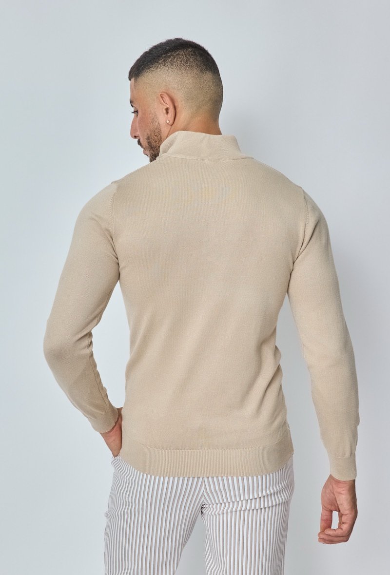 Een stijlvolle half-zip sweater met hoge kraag, uitgevoerd in een warme beige kleur. Gemaakt van een zachte knit die comfortabel draagt en zowel casual als netjes gecombineerd kan worden. Perfect voor elk seizoen en ideaal te stylen met zowel lichte als donkere broeken.