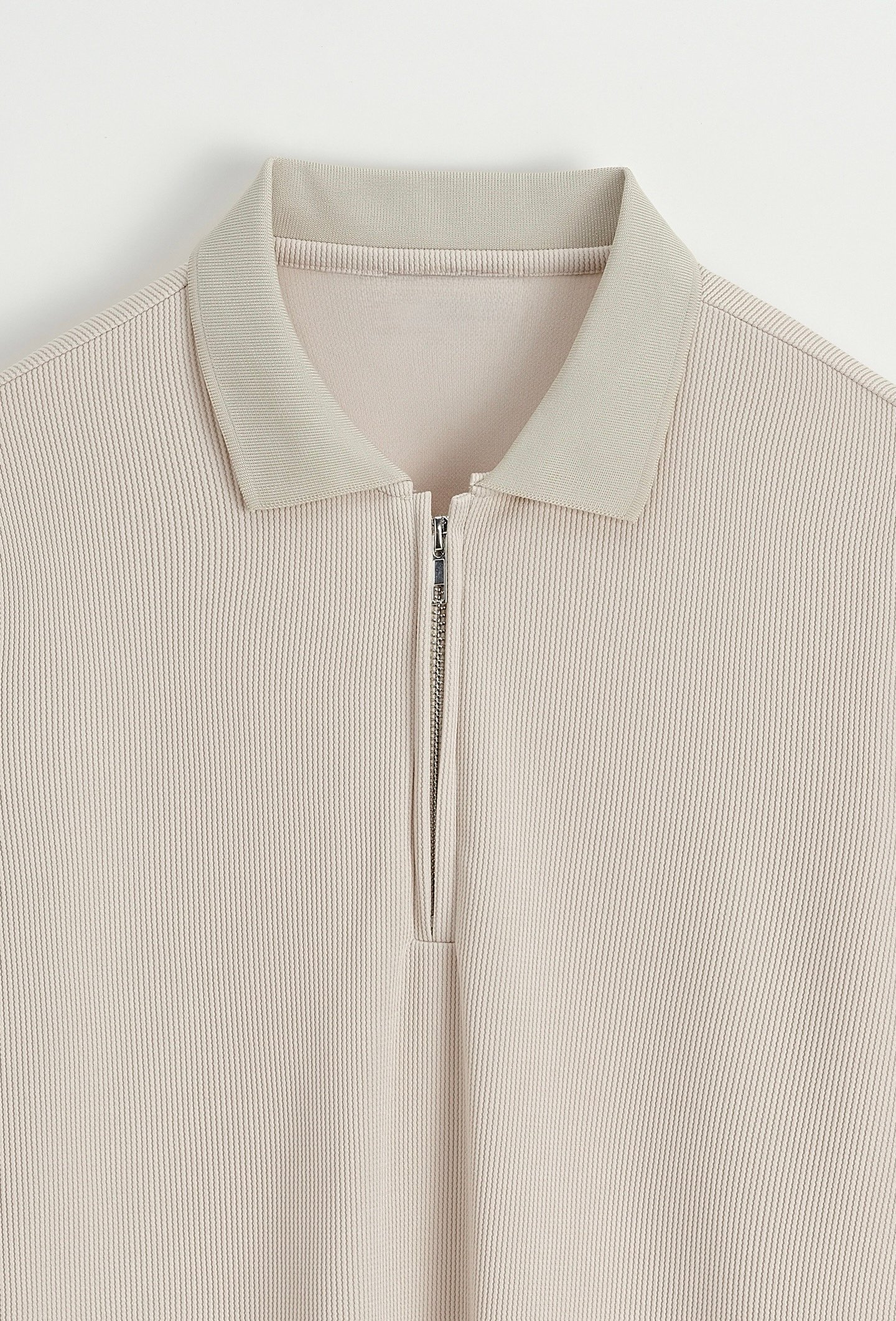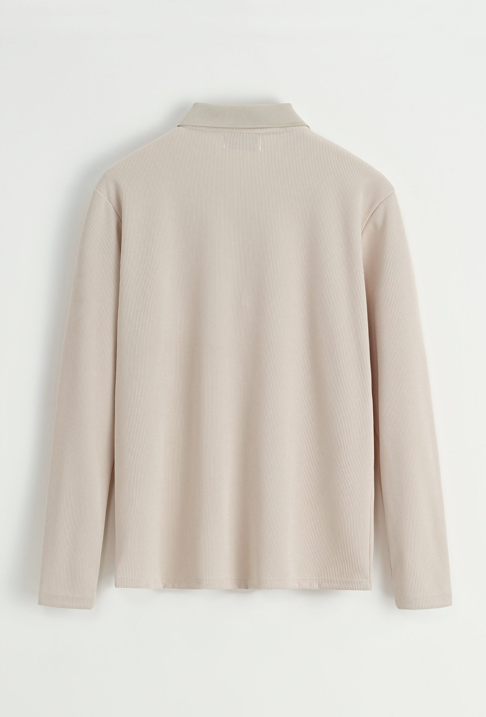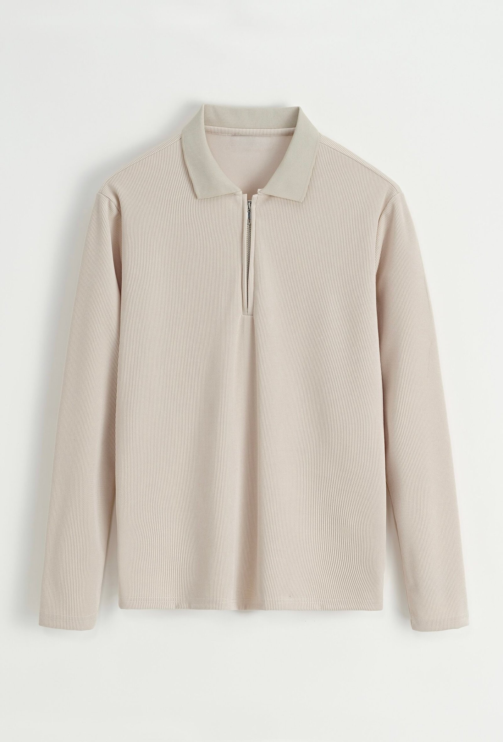 Een moderne longsleeve polo met ritssluiting, uitgevoerd in een zachte beige tint. Het subtiele ribpatroon en de strakke kraag geven deze top een cleane en eigentijdse uitstraling. Comfortabel, stijlvol en veelzijdig – ideaal om casual te dragen met jeans of als nette look met een pantalon.