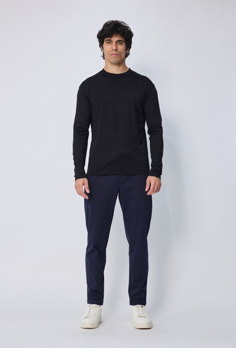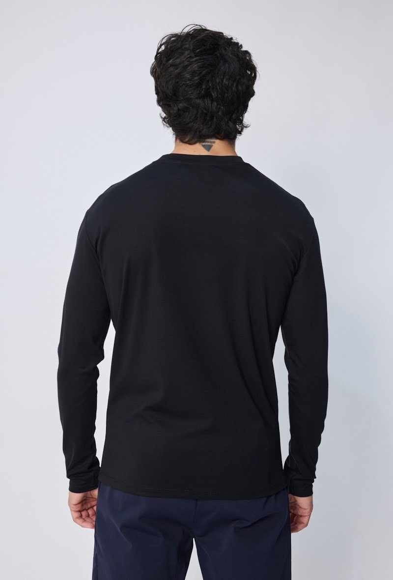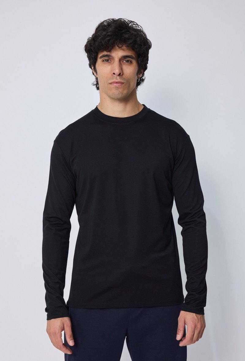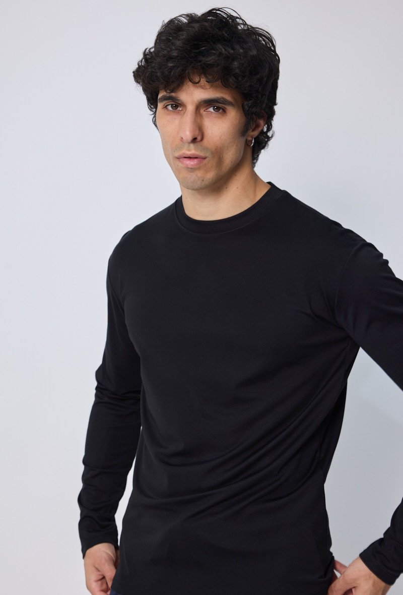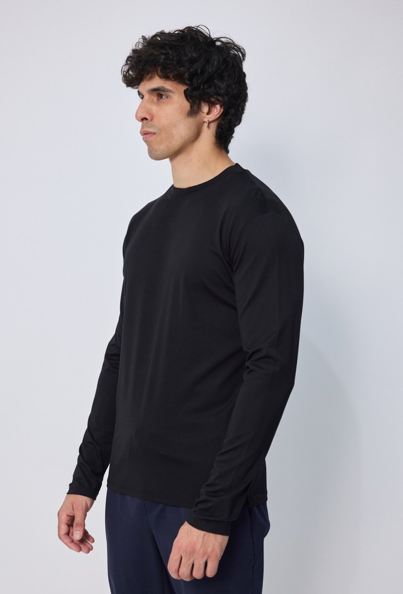 Een stijlvol en modern T-shirt met lange mouwen, uitgevoerd in zwart met een subtiele glans. Gemaakt van een hoogwaardige mix die zacht aanvoelt en zorgt voor een luxe uitstraling. De rechte pasvorm en lichte stretch maken dit shirt comfortabel én veelzijdig: ideaal voor zowel casual outfits als meer geklede combinaties.