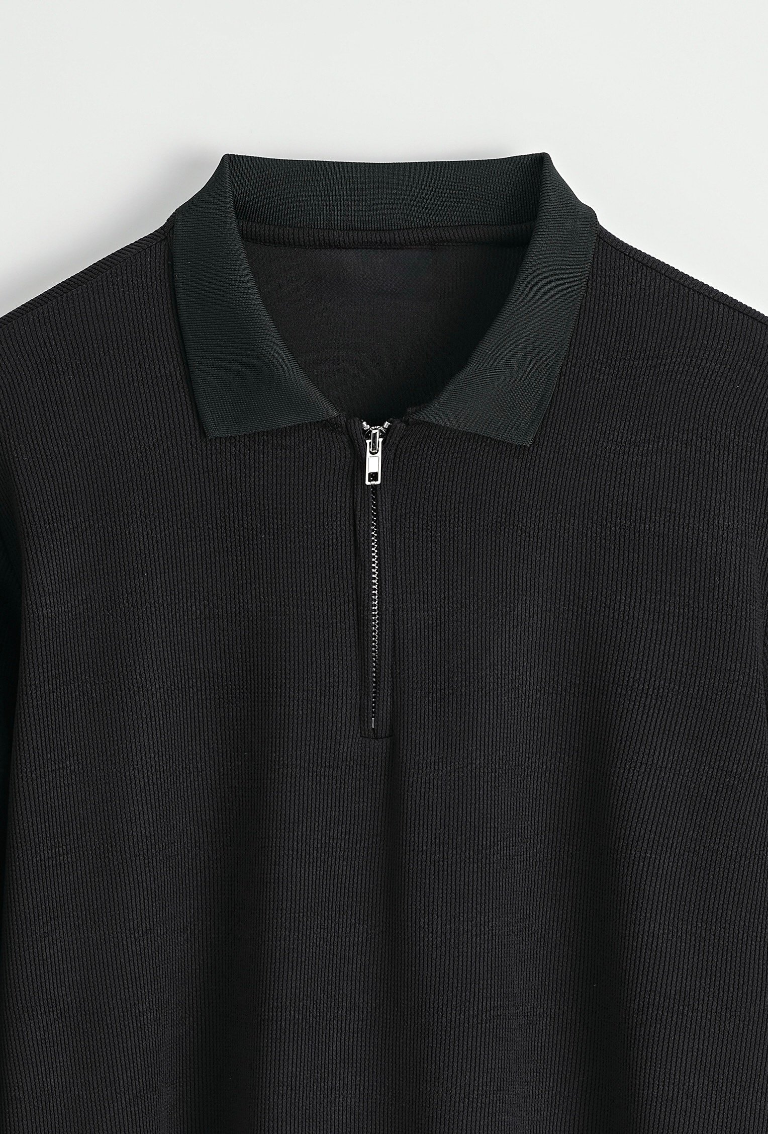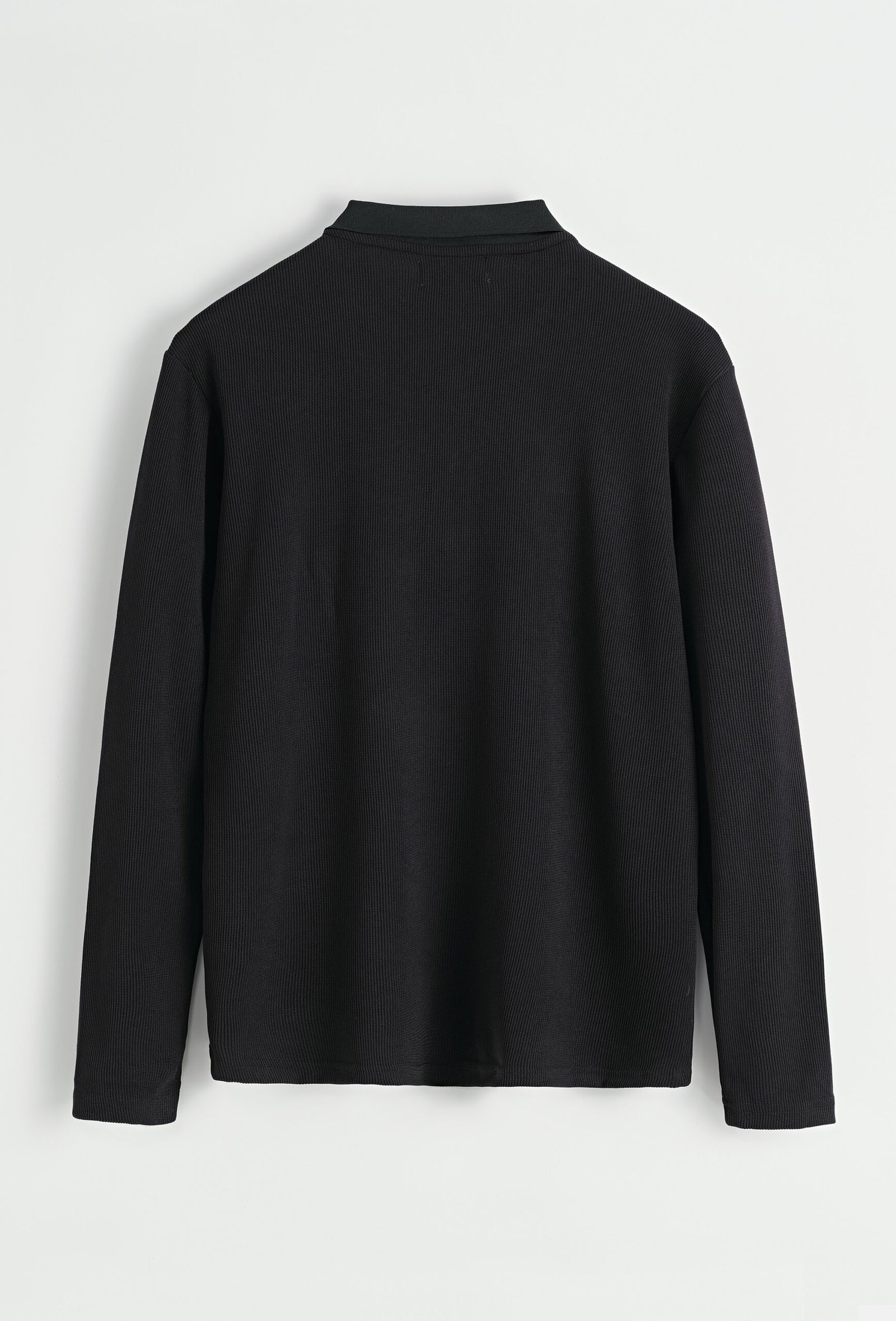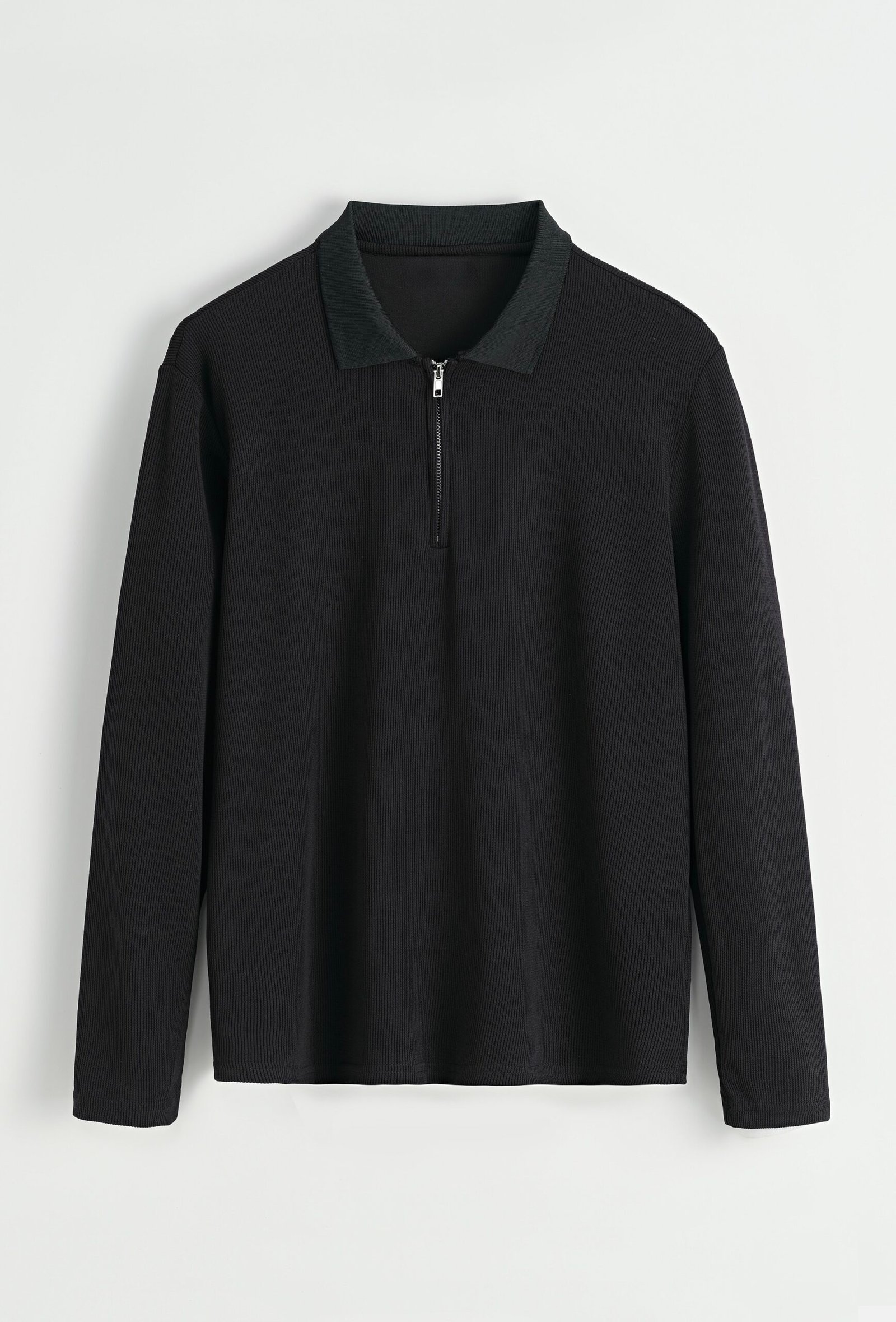 Een moderne longsleeve polo met ritssluiting, uitgevoerd in een zachte zwarte tint. Het subtiele ribpatroon en de strakke kraag geven deze top een cleane en eigentijdse uitstraling. Comfortabel, stijlvol en veelzijdig – ideaal om casual te dragen met jeans of als nette look met een pantalon.
