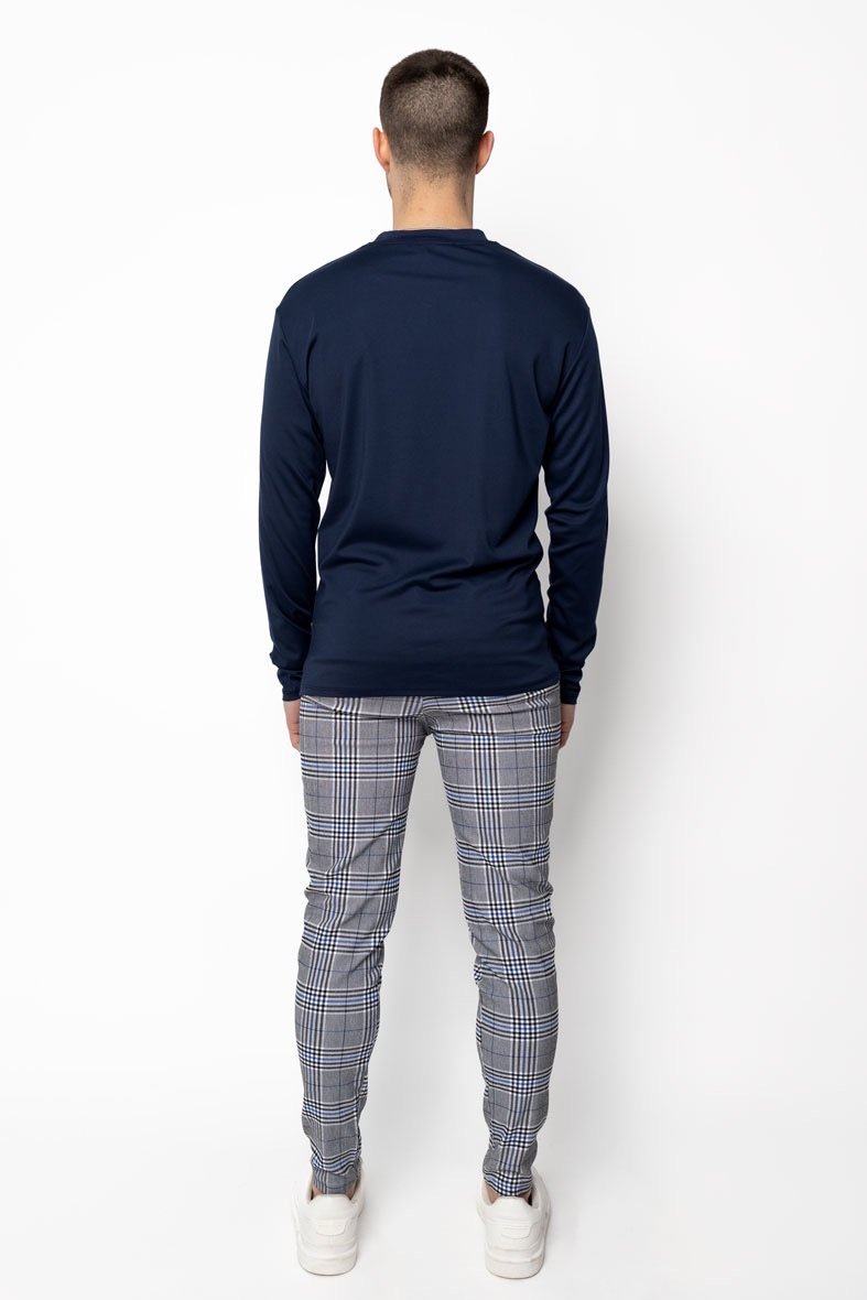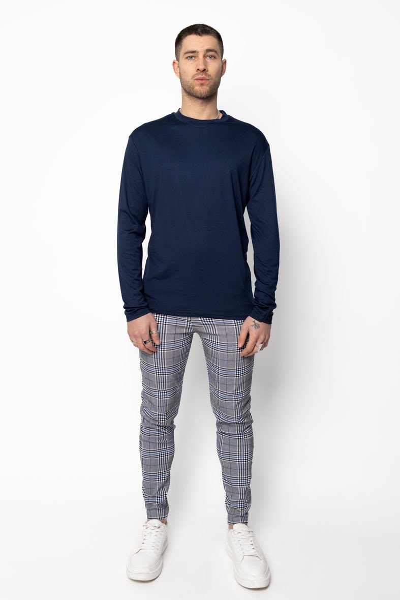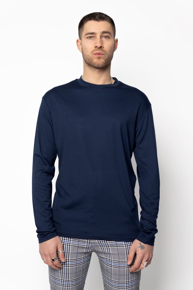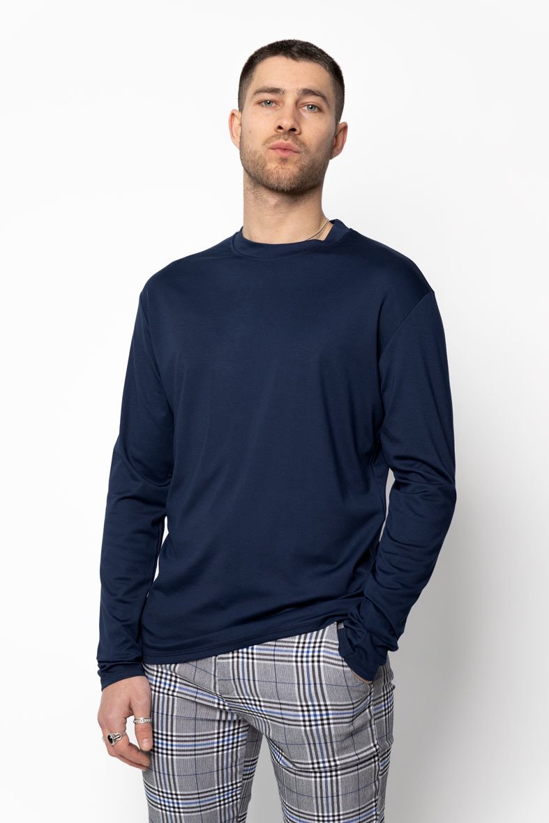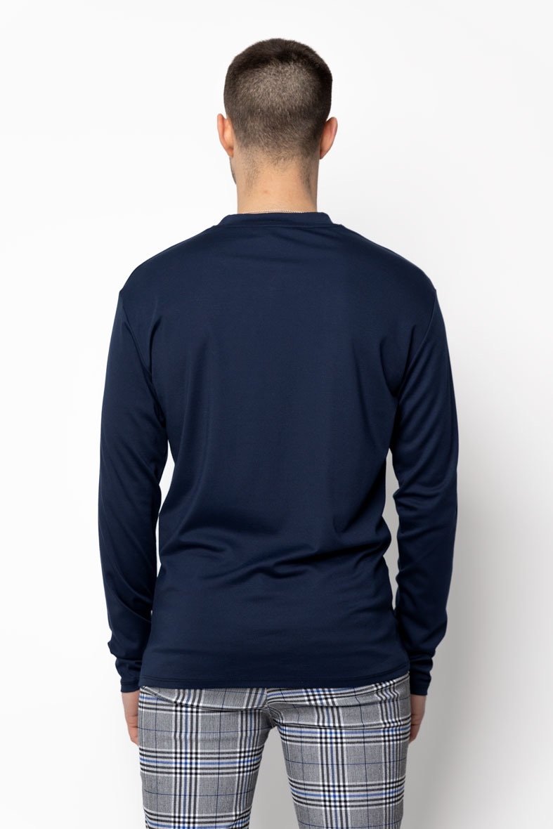 Een stijlvolle longsleeve in navy blue, uitgevoerd in een licht glanzende stof die zorgt voor een moderne en luxe uitstraling. De comfortabele pasvorm en zachte feel maken dit item ideaal voor dagelijks gebruik, terwijl de diepe navy kleur moeiteloos combineert met zowel casual als nette outfits.