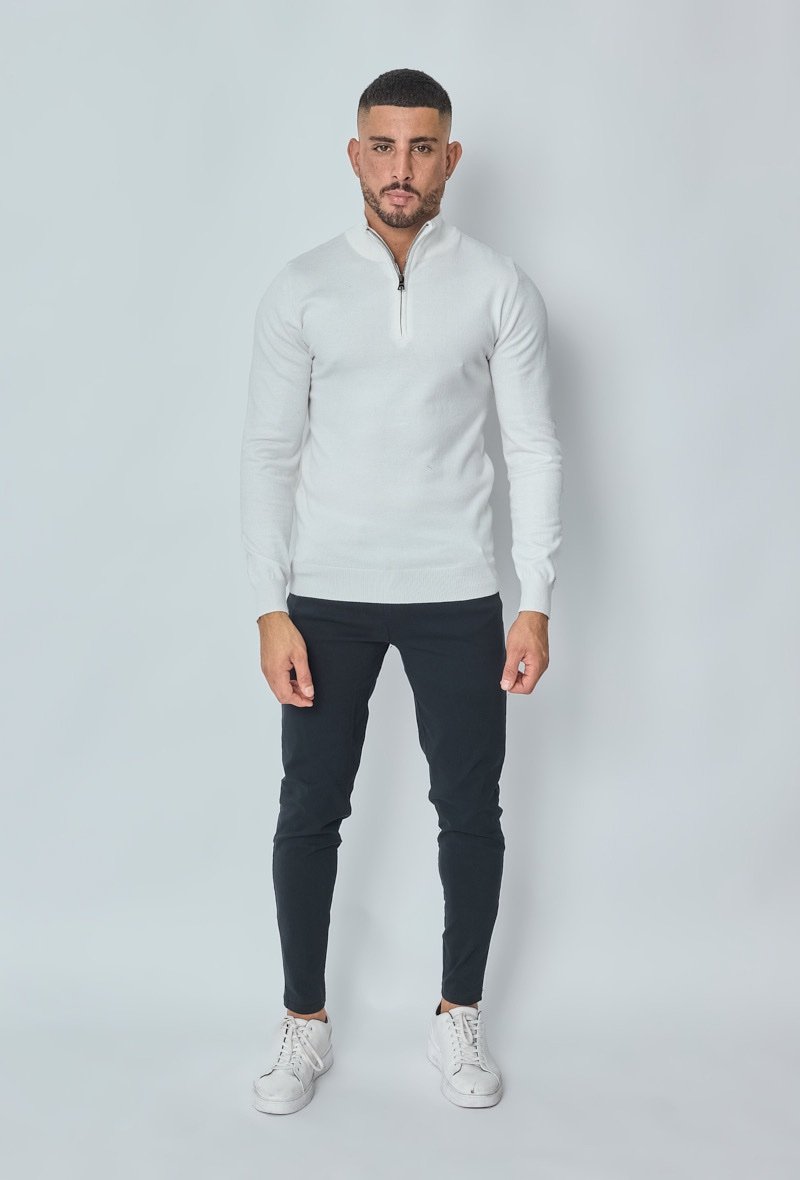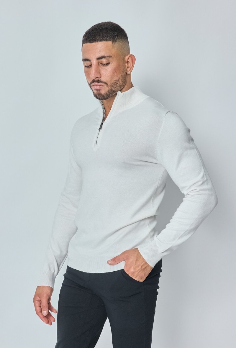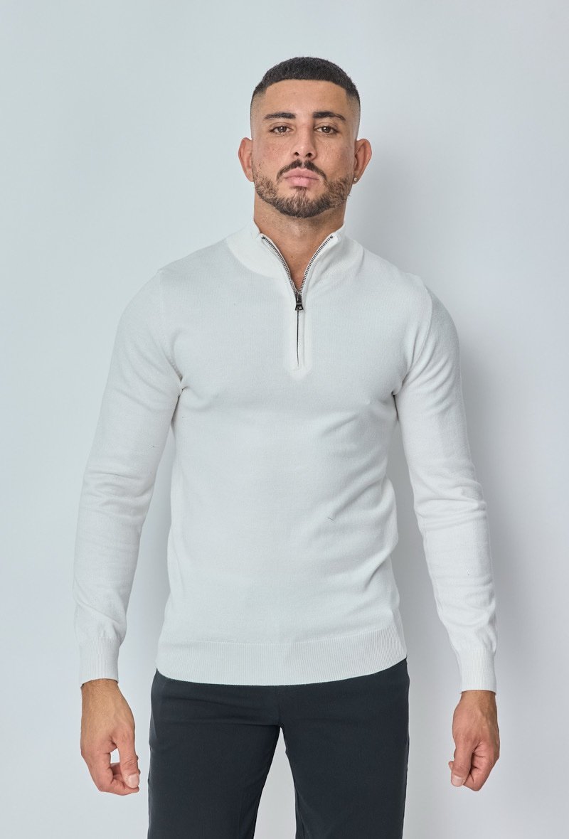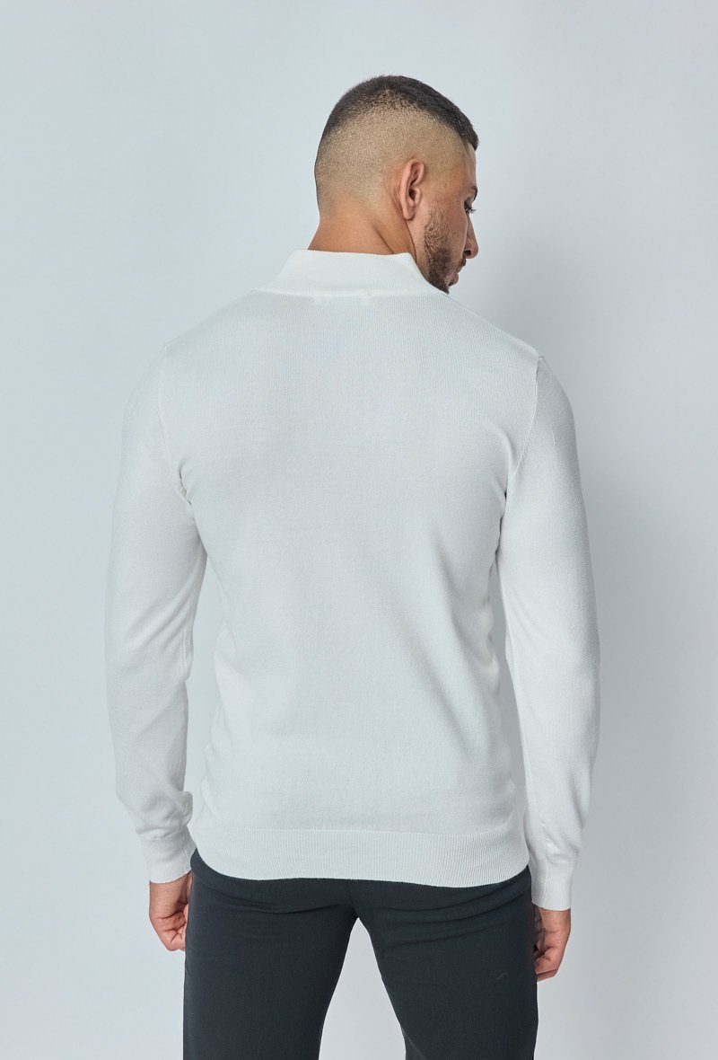 Een strakke en moderne sweater met een halve ritssluiting en hoge kraag. Uitgevoerd in een frisse witte kleur en gemaakt van een zachte, comfortabele knit. Het tijdloze design maakt deze sweater ideaal om zowel casual als smart te dragen – combineer met jeans voor een relaxte look of met een pantalon voor een nette outfit.