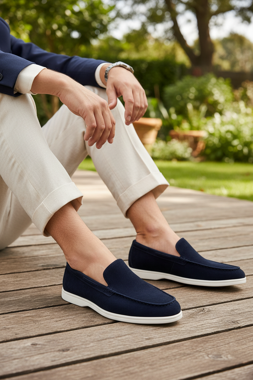 Diep navy blauw voor een verfijnde look. Buiten gemaakt van premium suède, met een leren binnenkant en comfortabele witte rubberen zool. Perfect bij jeans, chino’s of zomerse linnen broeken.